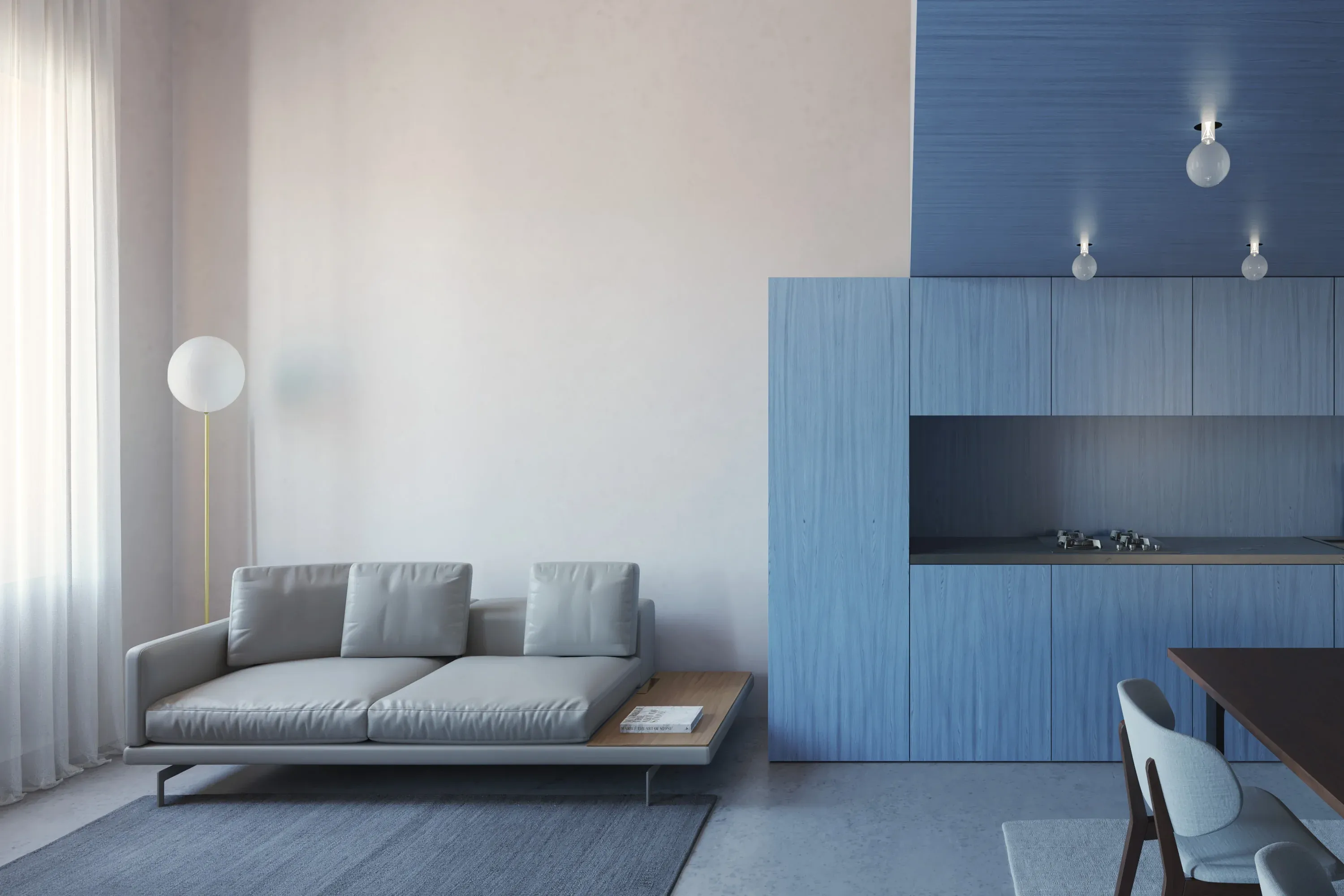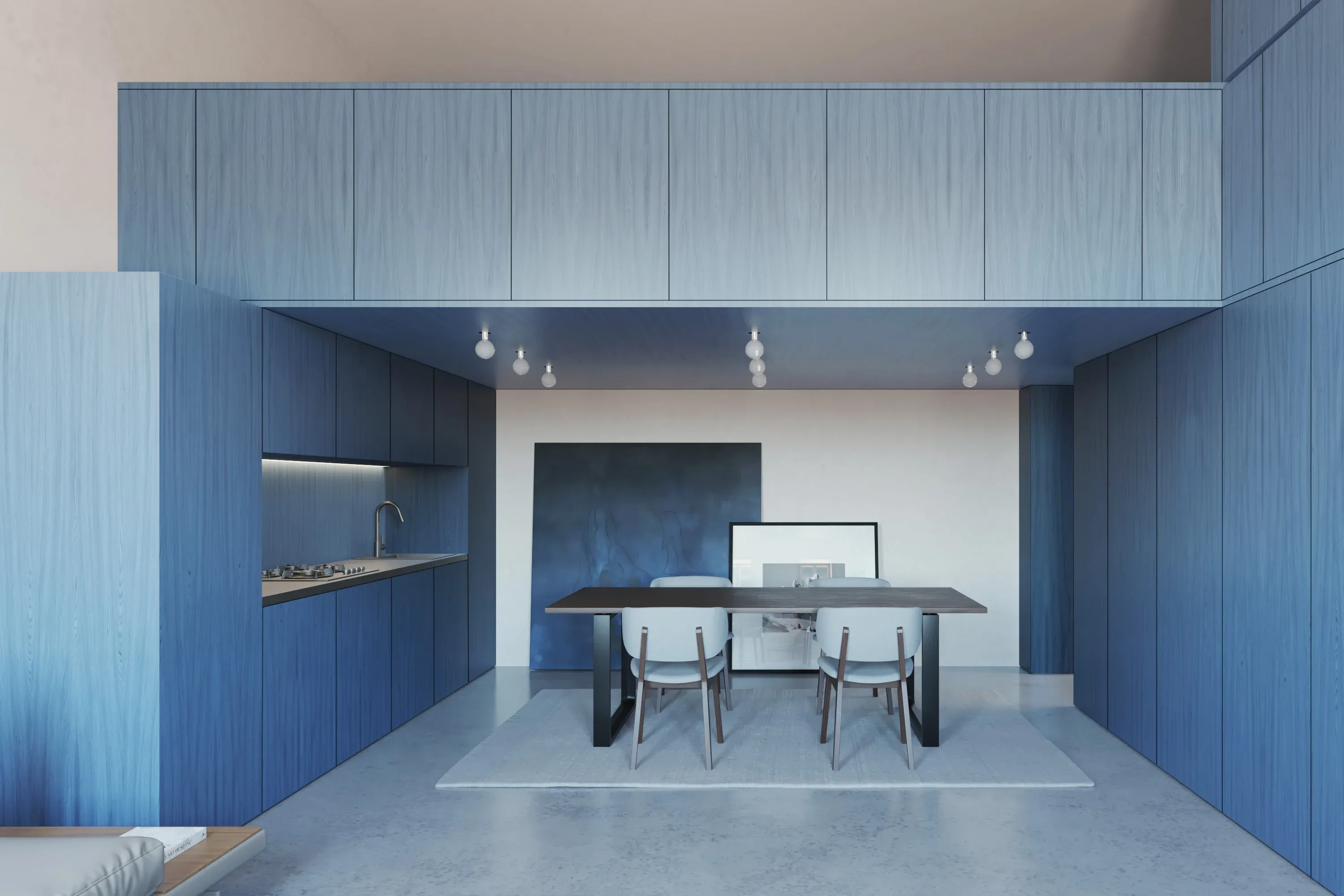 L’intervento evita la realizzazione di nuove opere murarie e affida all’arredo il ruolo di costruire lo spazio. Al piano terra, il volume blu integra la cucina e la zona pranzo, quest’ultima caratterizzata da un soffitto ribassato in legno che ospita corpi illuminanti a vista, evocando l’immagine di un cielo stellato. Sempre al piano terra, una grande parete attrezzata si estende per tutta l’altezza dell’appartamento, funzionando come un sistema continuo di contenimento. Al suo interno trovano posto la televisione, una porta a scomparsa che conduce al bagno e numerosi spazi contenitivi. Come in una grande libreria, una scala mobile su binario consente l’accesso ai livelli più alti del volume.