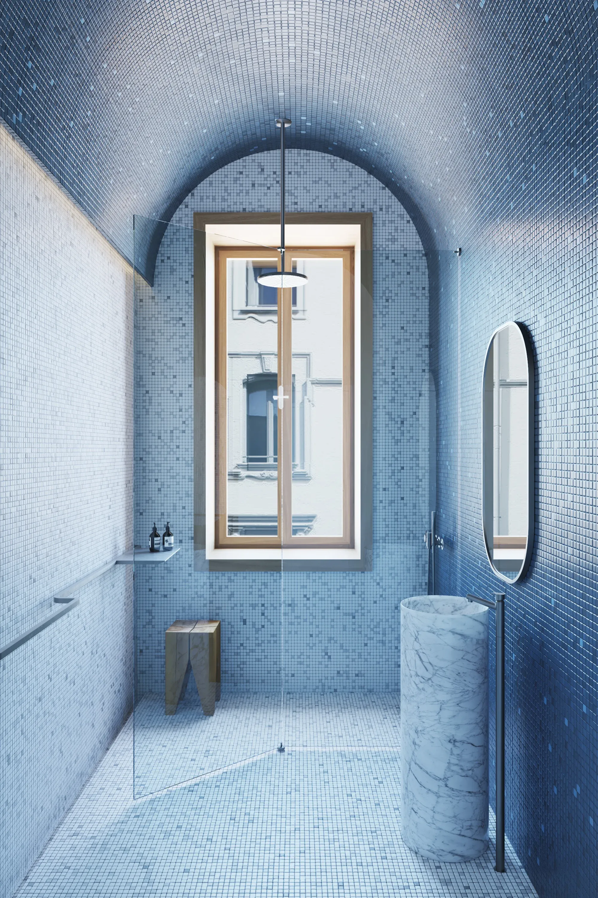 Il bagno, anch’esso declinato nei toni del blu, è concepito come uno spazio raccolto e immersivo. Il soffitto voltato, interamente rivestito in mosaico, crea un’atmosfera sospesa e quasi onirica, in contrasto con la razionalità del resto dell’abitazione. In prossimità dell’ingresso, una scala a chiocciola conduce al soppalco, dove è collocata la camera da letto. Quest’ultima è integrata all’interno di un armadio a ponte, mentre frontalmente una mensola in lamiera funge da piano di appoggio e piccolo studiolo, completando un ambiente essenziale e misurato.
