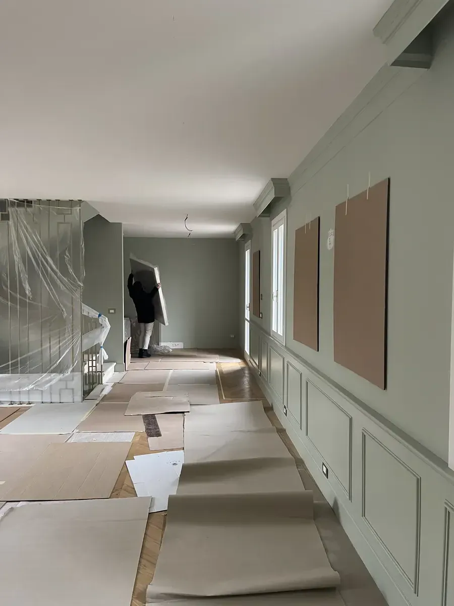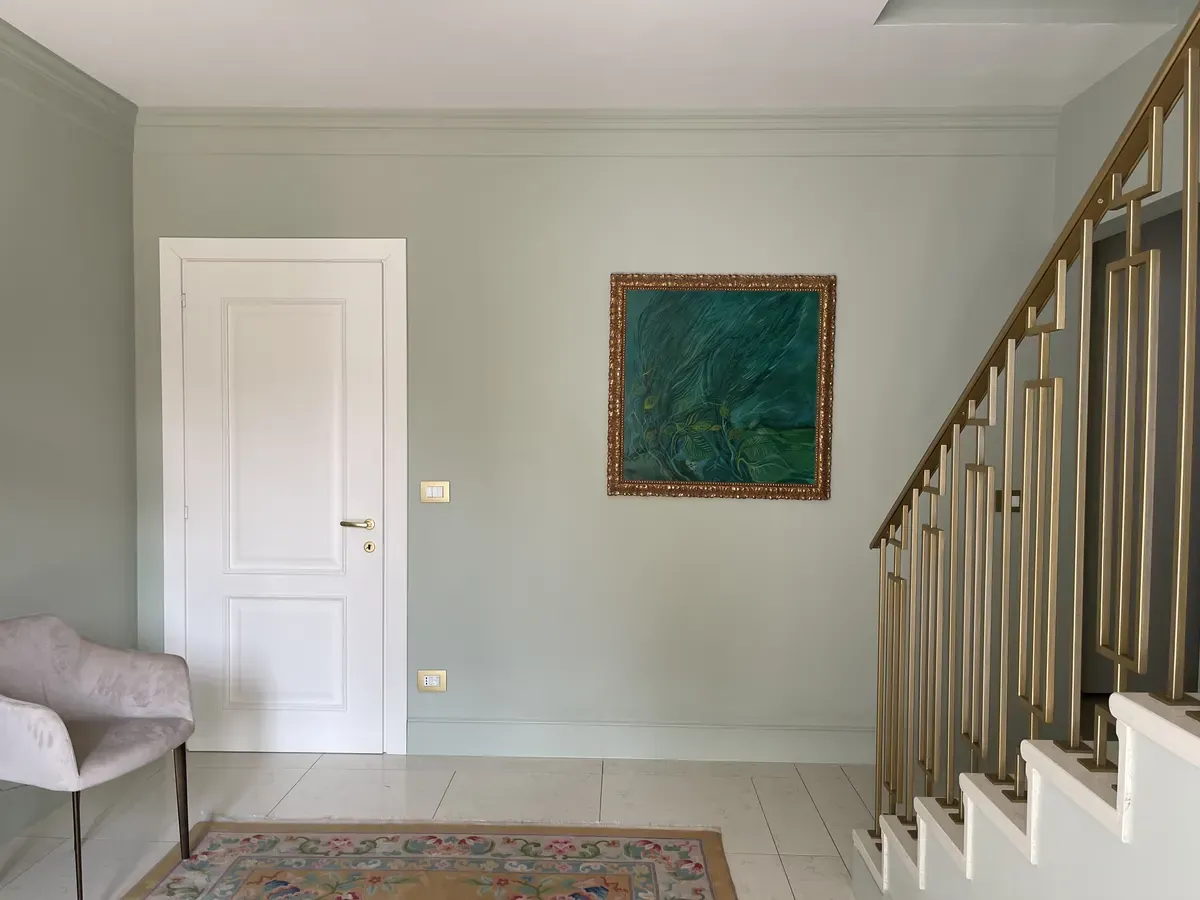 L’ingresso è concepito come elemento rappresentativo: una parete dogata in rovere naturale integra la porta di accesso al piano interrato dei garage, trasformando una funzione tecnica in un dettaglio architettonico. Una panca minimale, dalle linee orientali, completa lo spazio come seduta e piano d’appoggio. La scelta dei materiali definisce la gerarchia degli ambienti. Al piano terra, il pavimento in marmo dialoga con il corrimano in ottone e con le superfici verticali e i soffitti rifiniti in marmorino. Al piano primo, il “piano nobile”, il rovere posato a spina di pesce all’italiana introduce una tonalità più calda e domestica. Il concept nasce dalla passione del proprietario per l’arte e la fotografia: layout, arredi e illuminazione sono pensati per valorizzare le opere esposte, lasciando agli spazi un ruolo di sfondo neutro e calibrato.