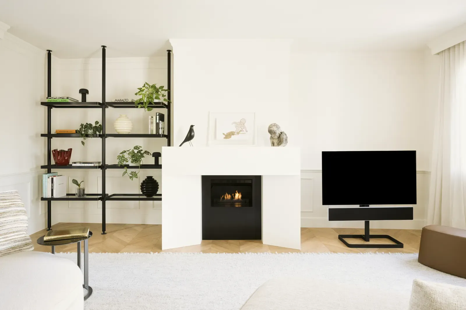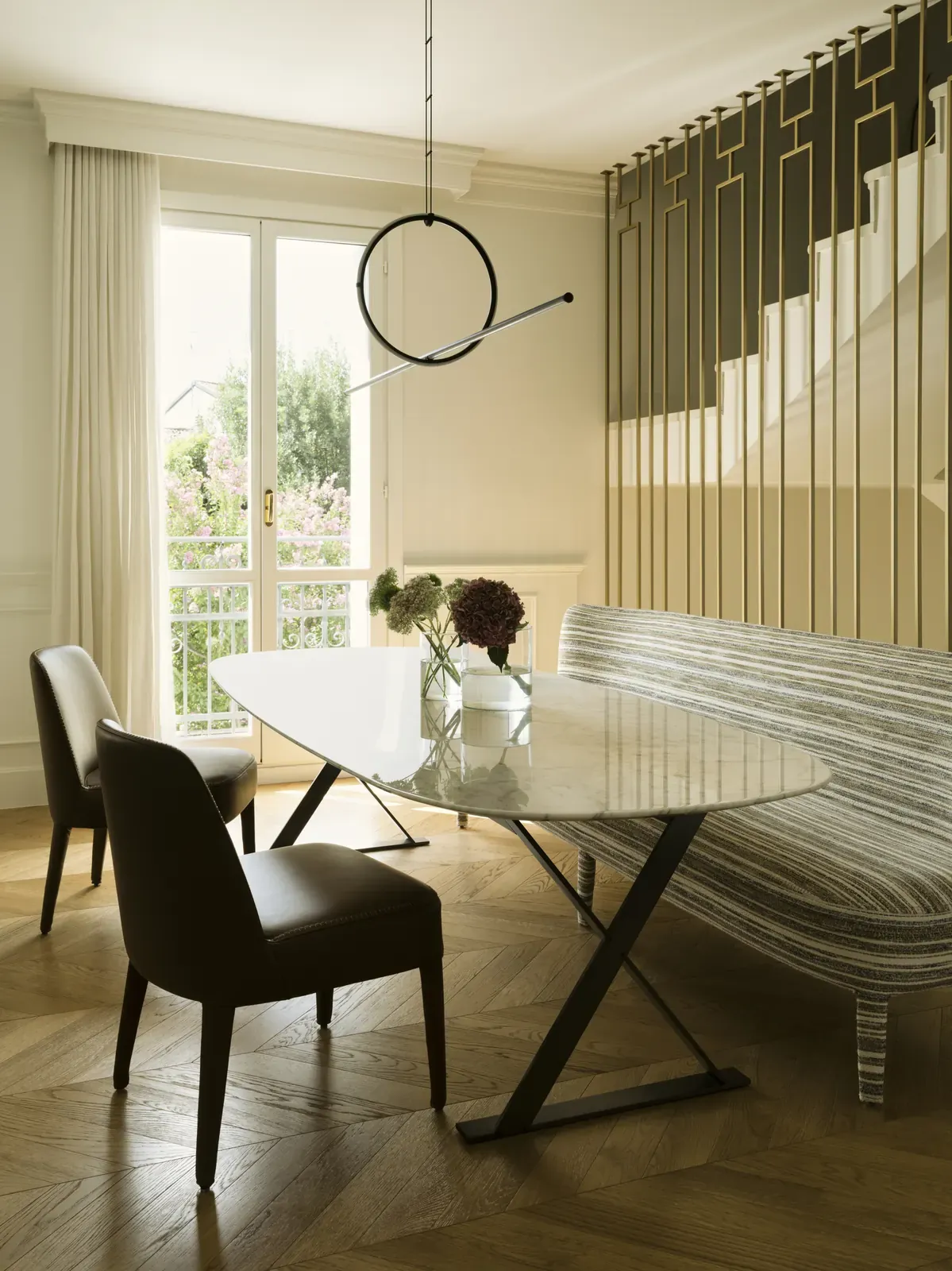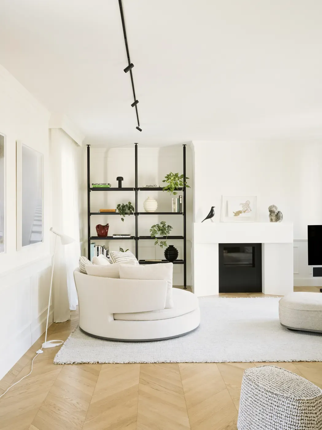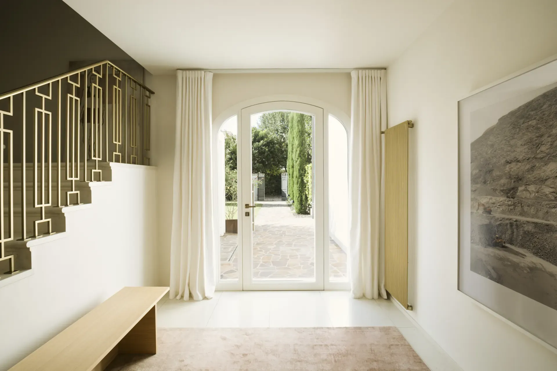 Salendo la scala in marmo si accede alla zona giorno, pensata come ambiente fluido e articolato. Un tavolo lounge con divanetto e poltroncine dialoga con un sistema di sedute composto da un divano girevole e da un elemento dalle forme organiche. Il camino diventa un elemento architettonico discreto ma riconoscibile. Un carter su misura in lamiera bianca, disegnato con spigoli netti, avvolge il focolare esistente generando delicati giochi di luce e ombra che ne alleggeriscono la presenza. A destra e a sinistra della zona giorno, ampie vetrate mettono in relazione diretta gli interni con il giardino, permettendo al verde di entrare negli spazi e di dialogare con la neutralità delle superfici, in un continuo scambio tra interno ed esterno.