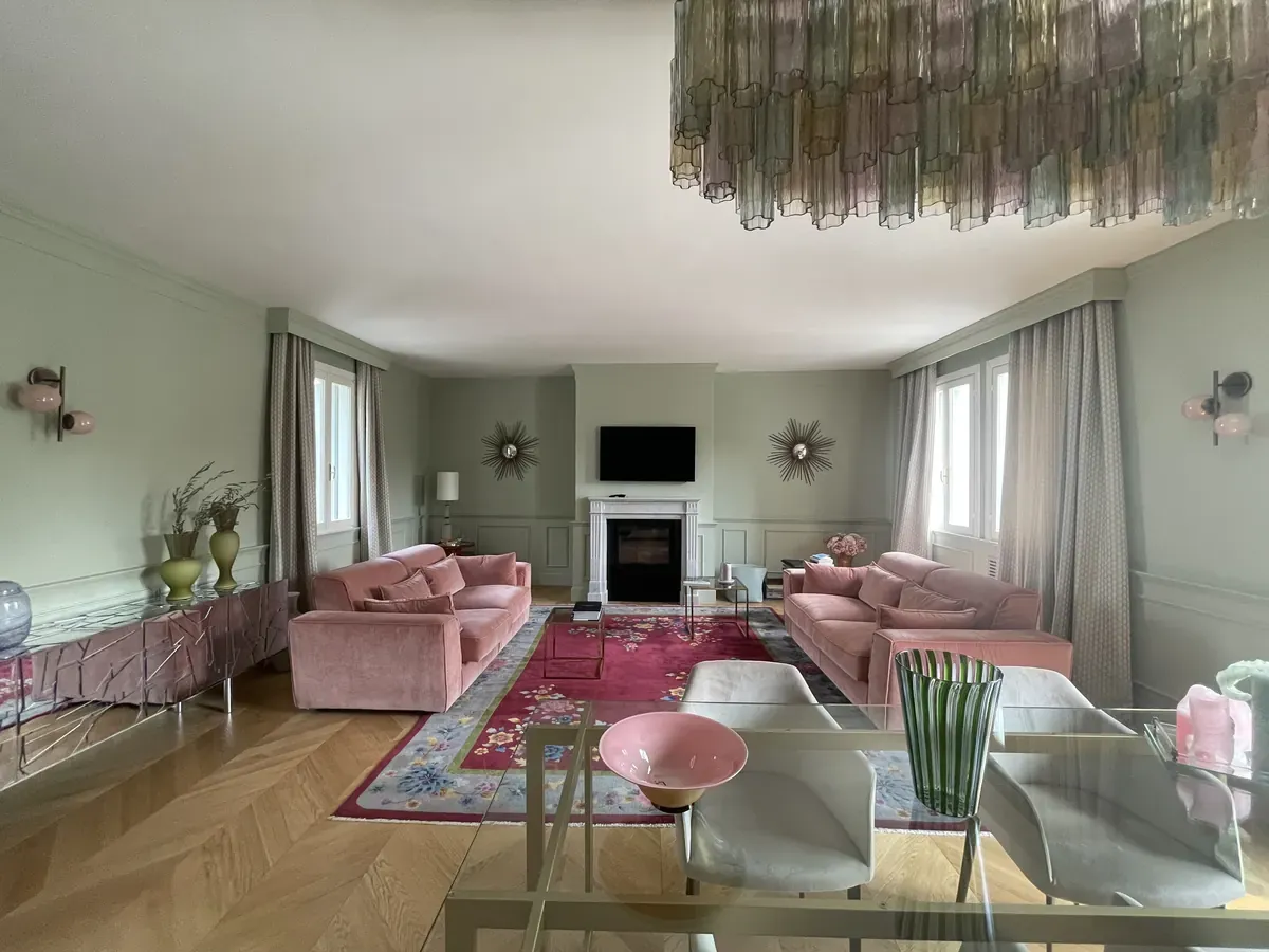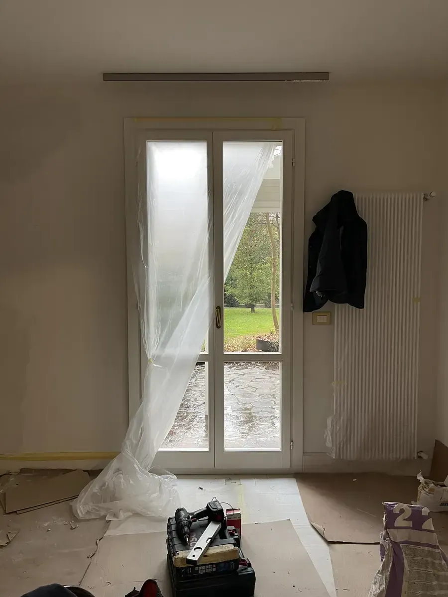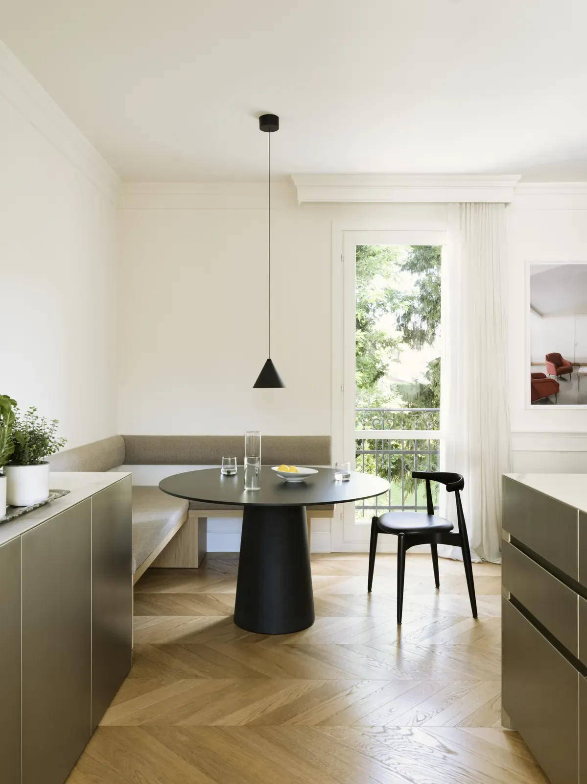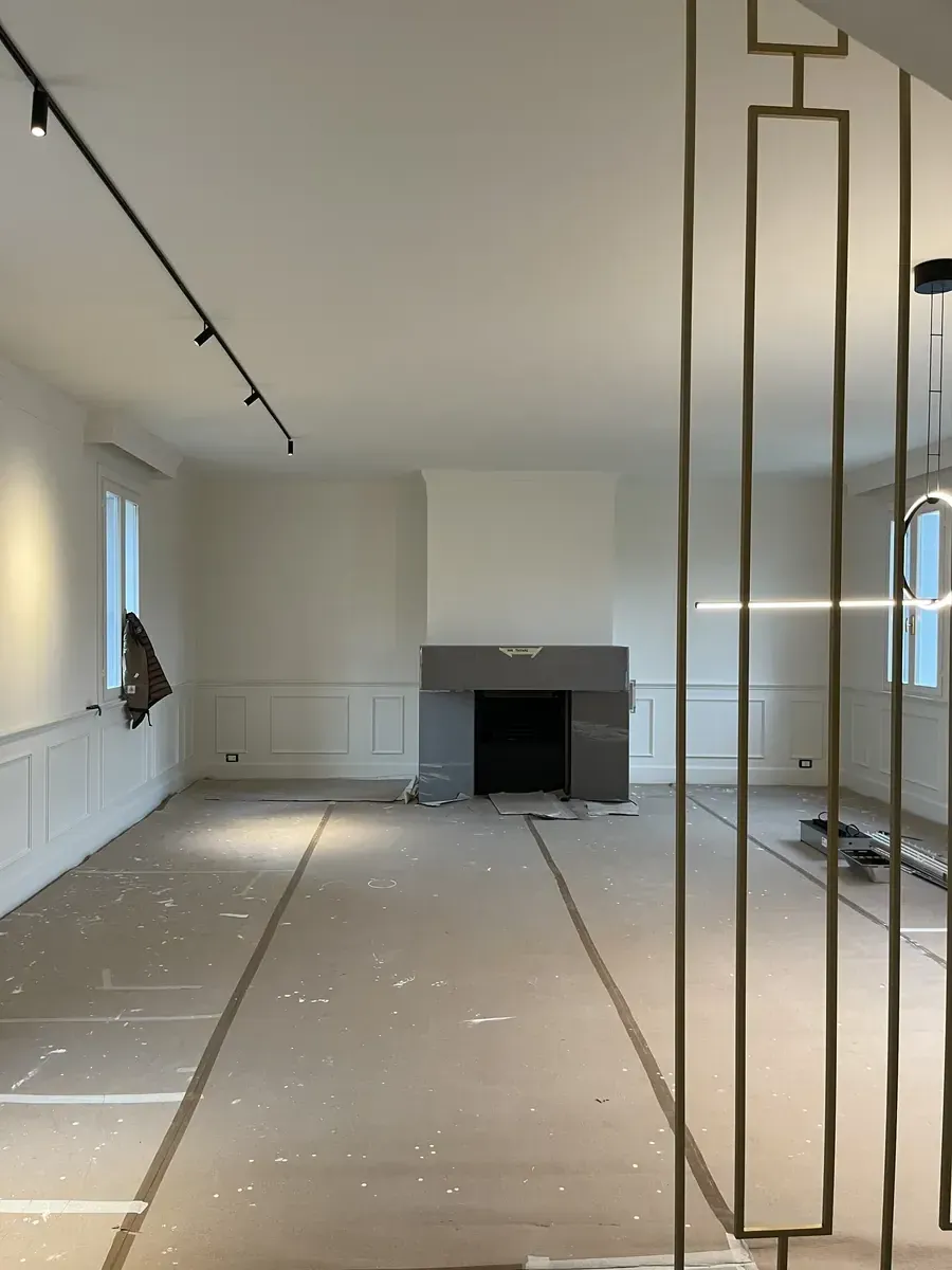 Salendo la scala in marmo si accede alla zona giorno, pensata come ambiente fluido e articolato. Un tavolo lounge con divanetto e poltroncine dialoga con un sistema di sedute composto da un divano girevole e da un elemento dalle forme organiche. Il camino diventa un elemento architettonico discreto ma riconoscibile. Un carter su misura in lamiera bianca, disegnato con spigoli netti, avvolge il focolare esistente generando delicati giochi di luce e ombra che ne alleggeriscono la presenza. A destra e a sinistra della zona giorno, ampie vetrate mettono in relazione diretta gli interni con il giardino, permettendo al verde di entrare negli spazi e di dialogare con la neutralità delle superfici, in un continuo scambio tra interno ed esterno.