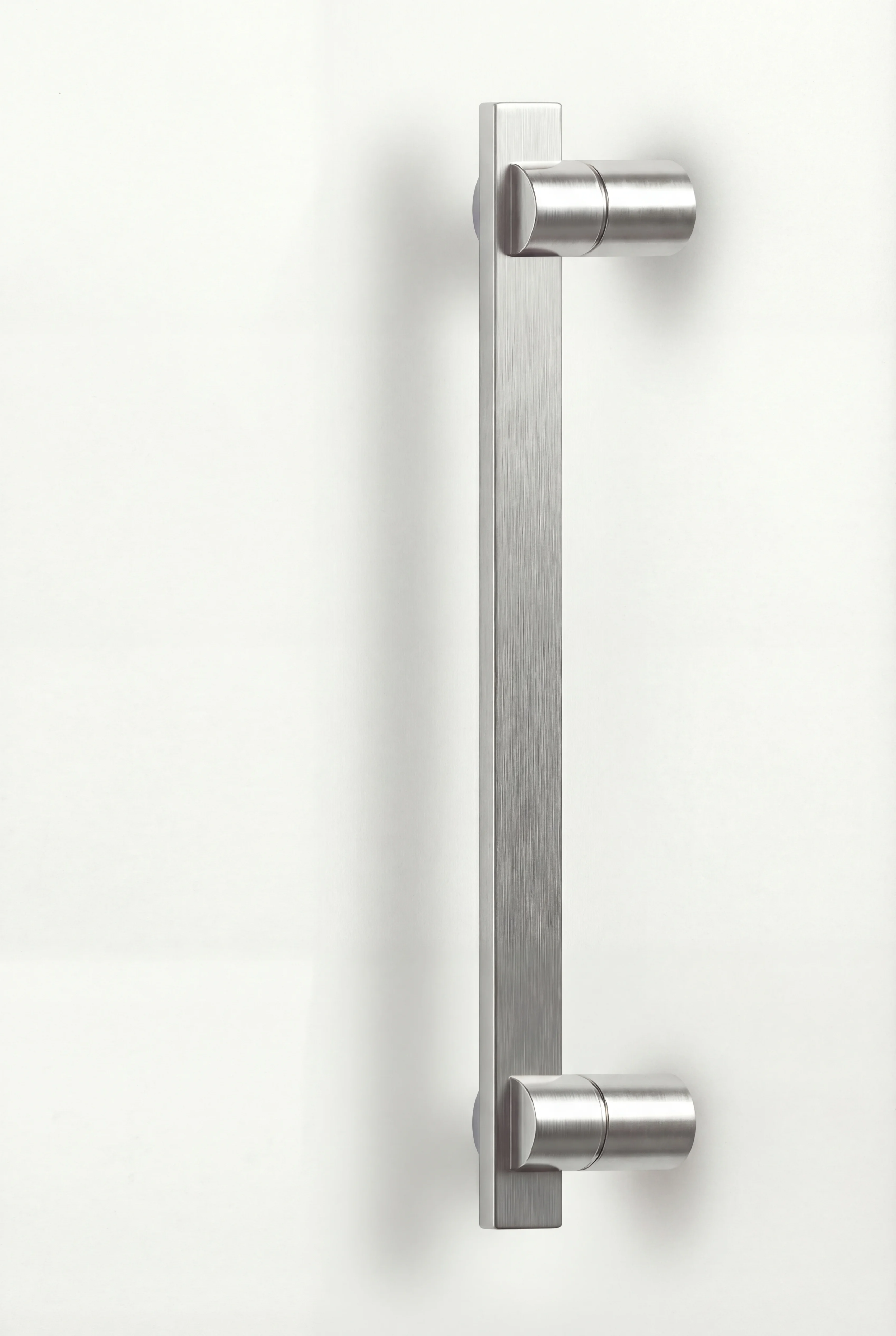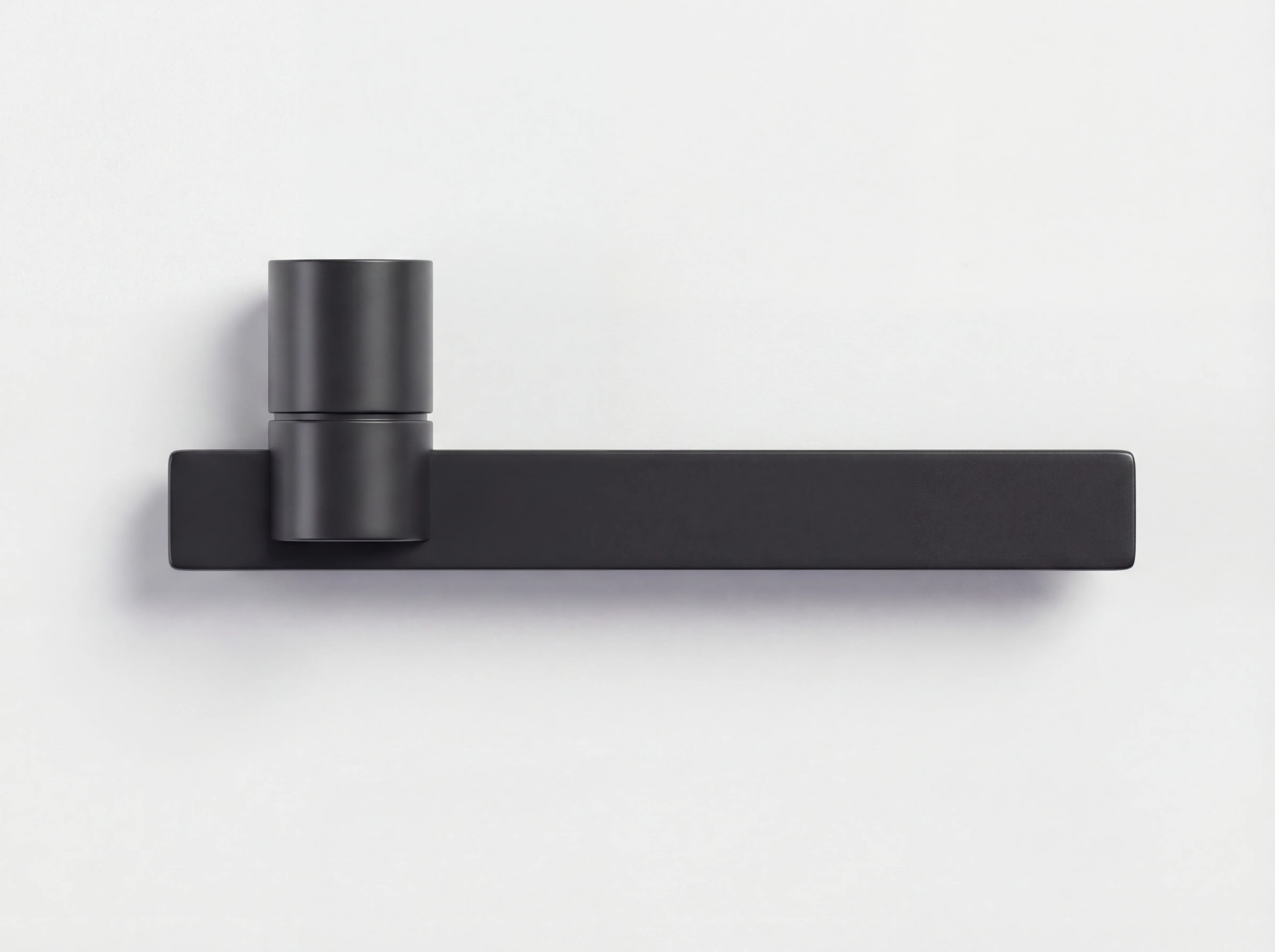 La composizione è essenziale e rigorosa. Un cilindro pieno funge da elemento di innesto, dal quale si sviluppa una lama sottile che definisce l’impugnatura. Il contrasto tra il volume compatto del supporto e la leggerezza della presa genera un equilibrio calibrato tra massa e linearità, restituendo un oggetto discreto ma riconoscibile.