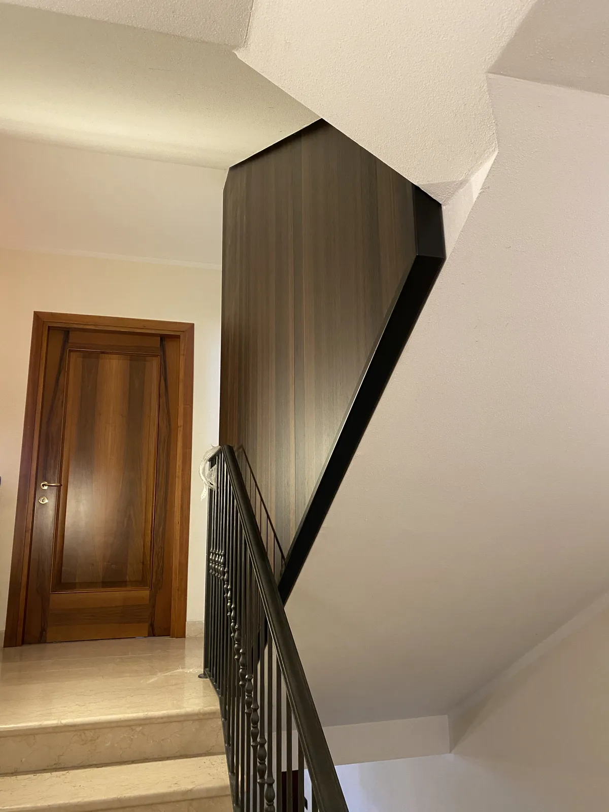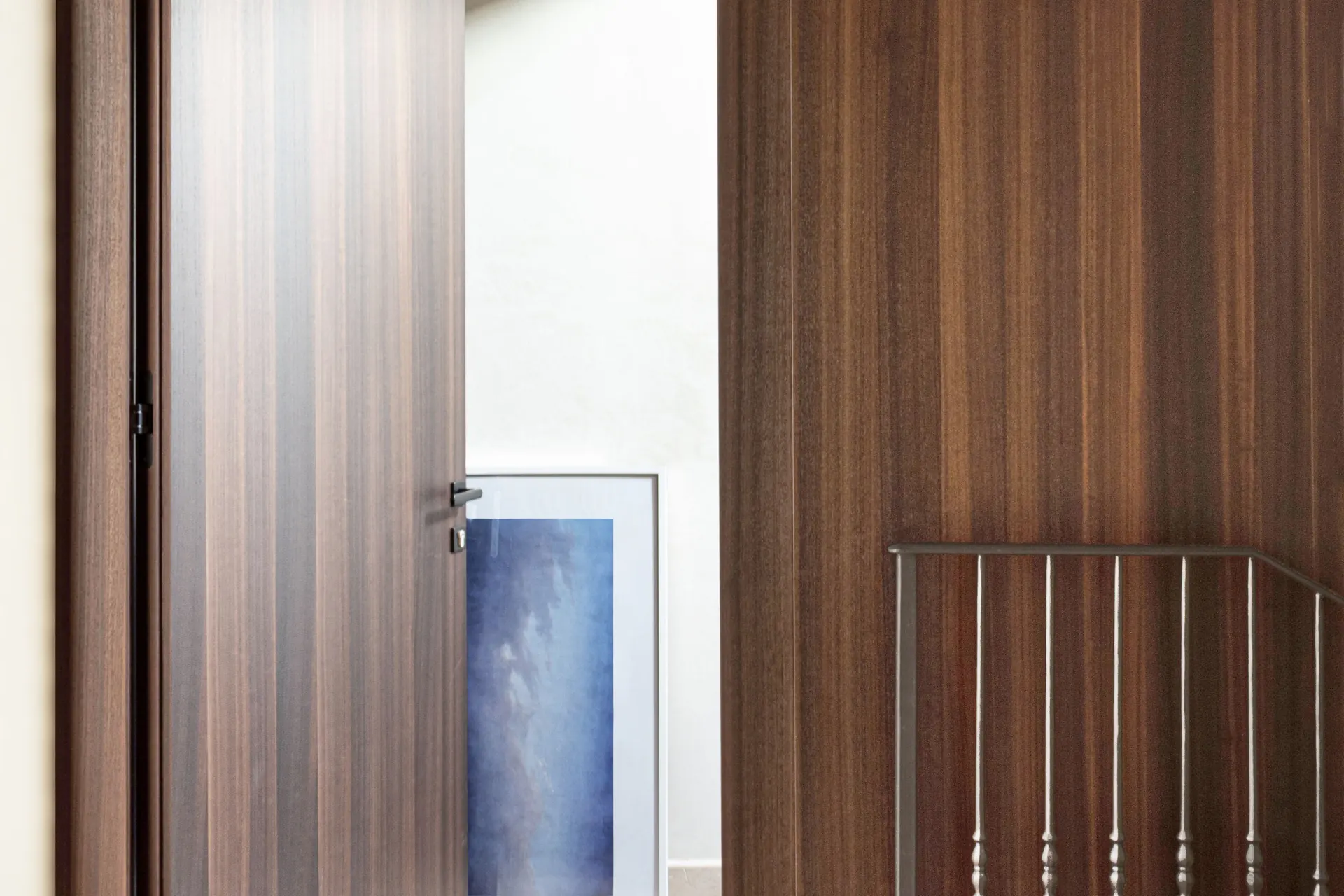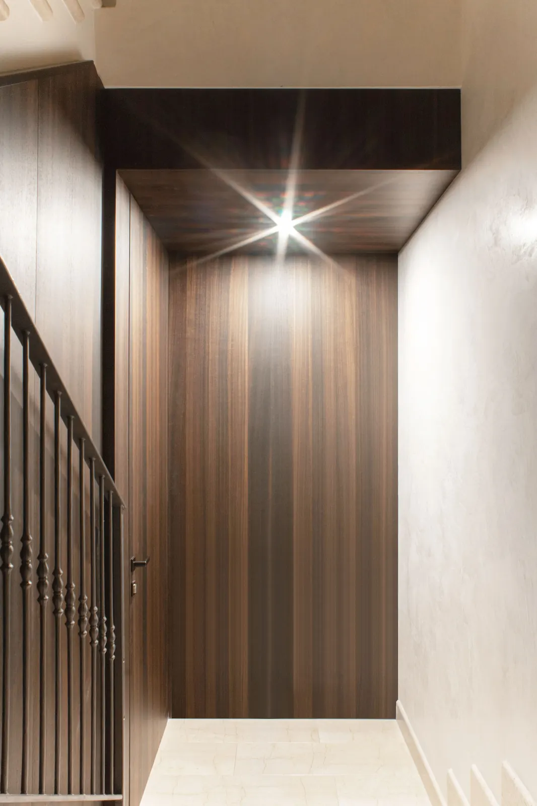 Elemento centrale del progetto è il sistema divisorio realizzato in eucalipto affumicato, scelto per la sua eleganza essenziale e per il dialogo materico con gli elementi storici della palazzina. Il nuovo volume si modella sul vano scala esistente e accompagna il percorso verso la zona giorno dell’attico, collocata all’ultimo piano. L’esigenza di suddividere gli spazi senza alterare le caratteristiche originali della residenza ha guidato l’intero processo progettuale. L’irregolarità degli ambienti ha richiesto soluzioni su misura, capaci di inserirsi con un impatto minimo sia dal punto di vista visivo che installativo.