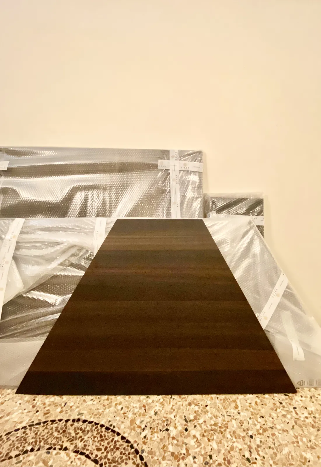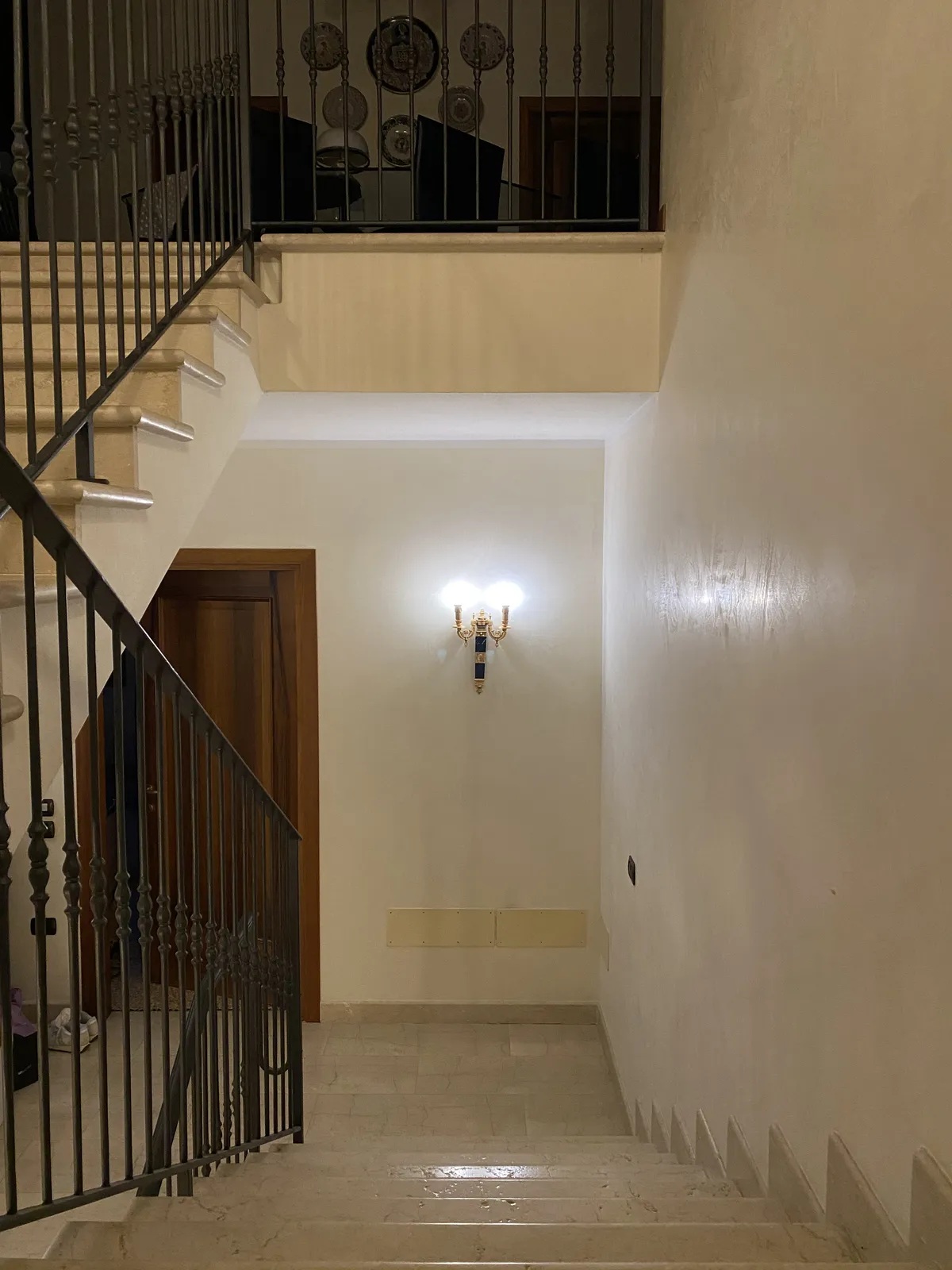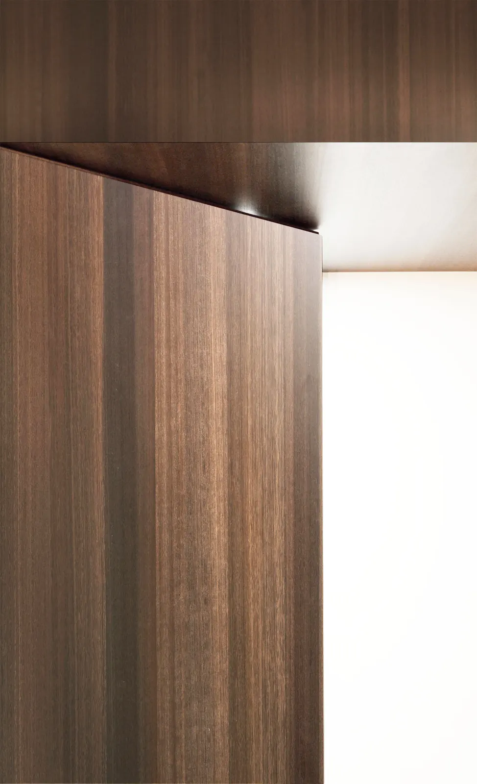 Elemento centrale del progetto è il sistema divisorio realizzato in eucalipto affumicato, scelto per la sua eleganza essenziale e per il dialogo materico con gli elementi storici della palazzina. Il nuovo volume si modella sul vano scala esistente e accompagna il percorso verso la zona giorno dell’attico, collocata all’ultimo piano. L’esigenza di suddividere gli spazi senza alterare le caratteristiche originali della residenza ha guidato l’intero processo progettuale. L’irregolarità degli ambienti ha richiesto soluzioni su misura, capaci di inserirsi con un impatto minimo sia dal punto di vista visivo che installativo.