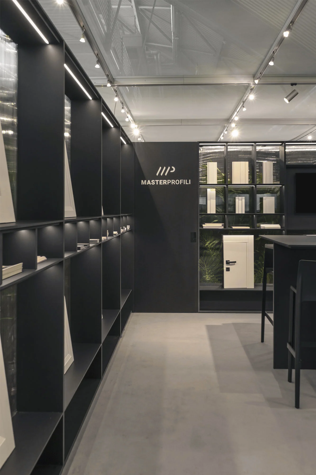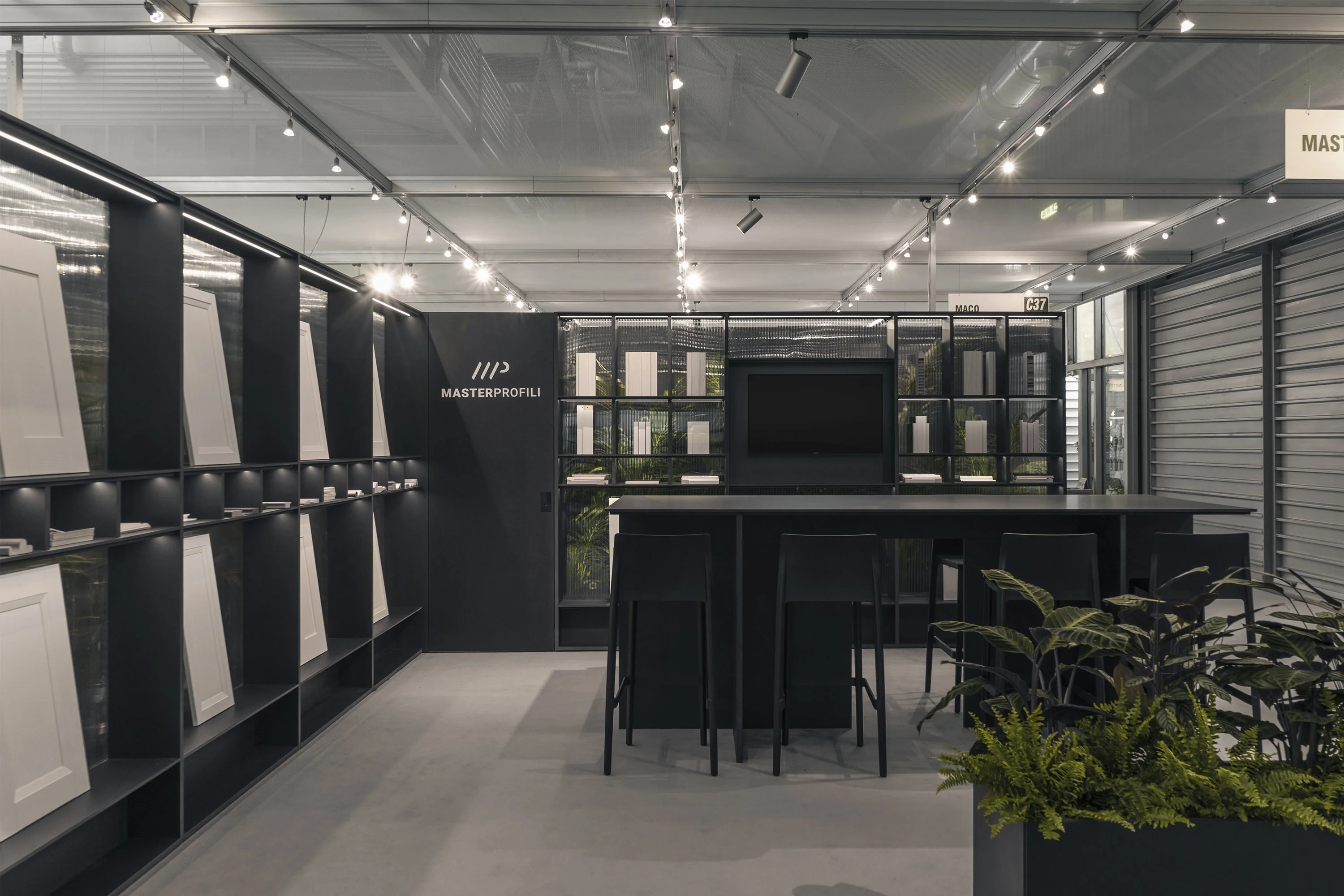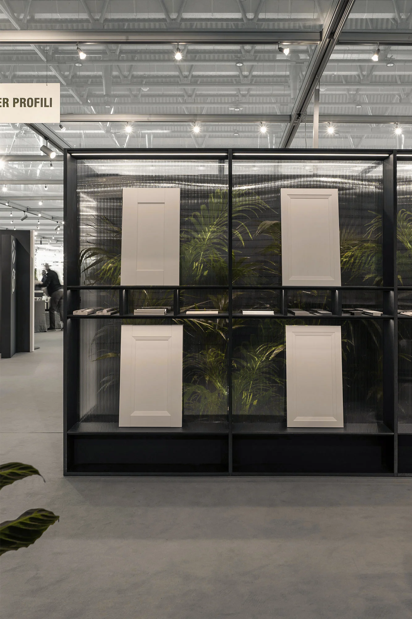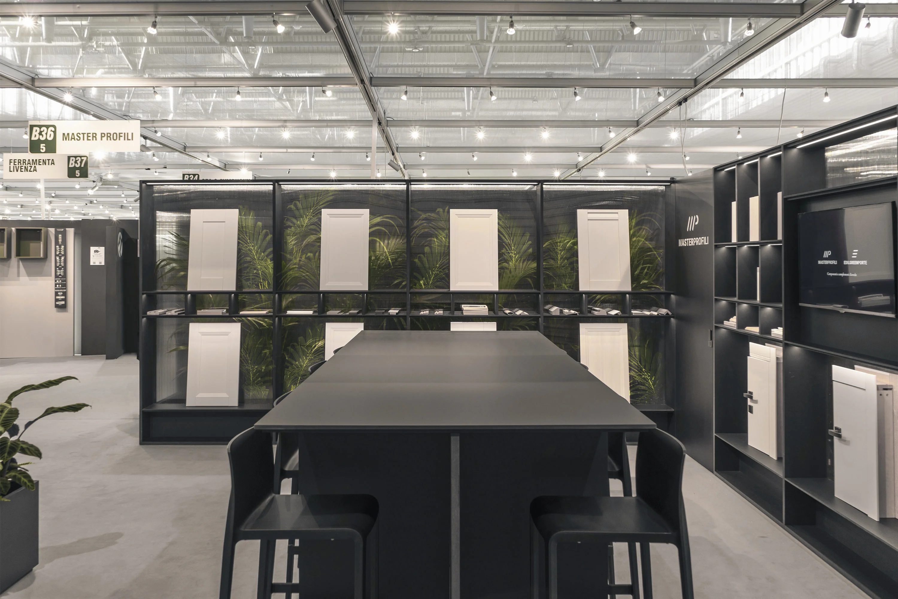 Il concept si fonda sull’idea di una “parete abitata”: un dispositivo architettonico continuo che, come una serra contemporanea, accoglie e integra al proprio interno la vegetazione. Le piante non sono un semplice elemento decorativo, ma parte integrante della composizione, contribuendo a costruire una scenografia naturale che avvolge il visitatore ed esalta i prodotti esposti. Il verde diventa così filtro, sfondo e struttura narrativa del percorso. Le strutture sono interamente realizzate in MDF in pasta nera, scelta che conferisce profondità materica e un carattere deciso all’allestimento, creando un contrasto netto con la leggerezza della vegetazione.